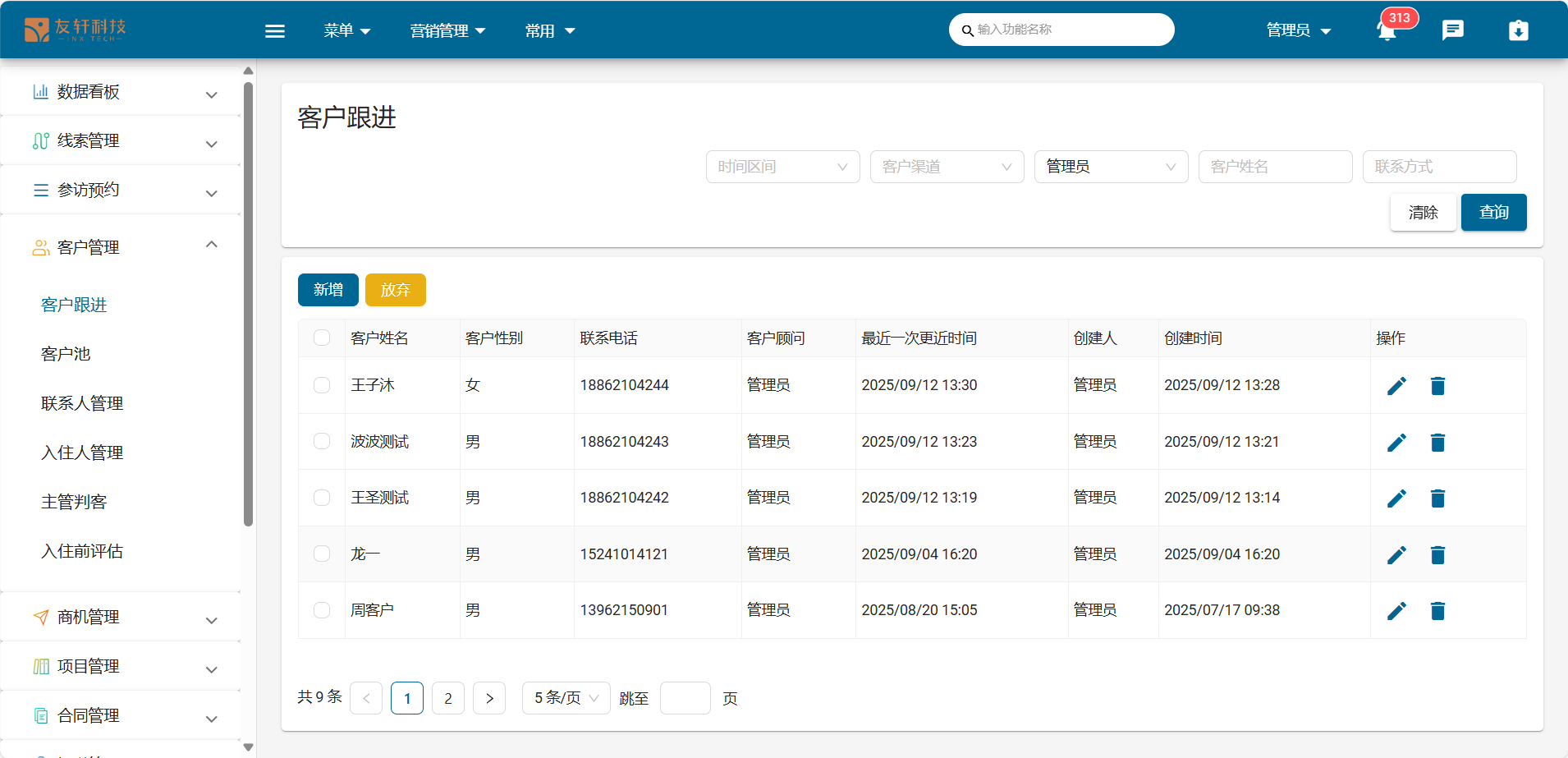 • 销售管理以客户为先,协助运营人员对营销获客进行管理为核心,搭配PC端后台、客户小程序、员工APP等软件设施形成完整的销售服务闭环,平台具备智慧、高效、专业、支持定制开发等特色,提供解决销售团队运营痛点以及信息化解决方案。